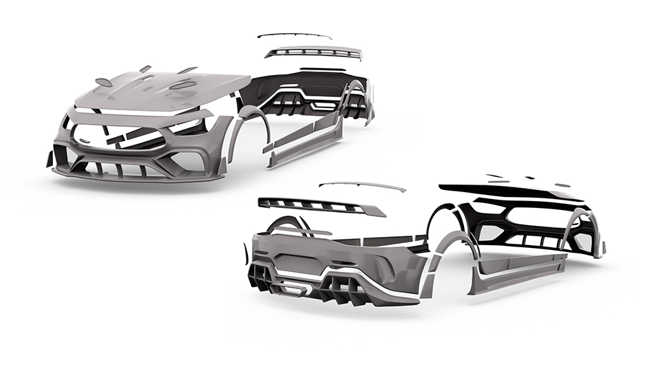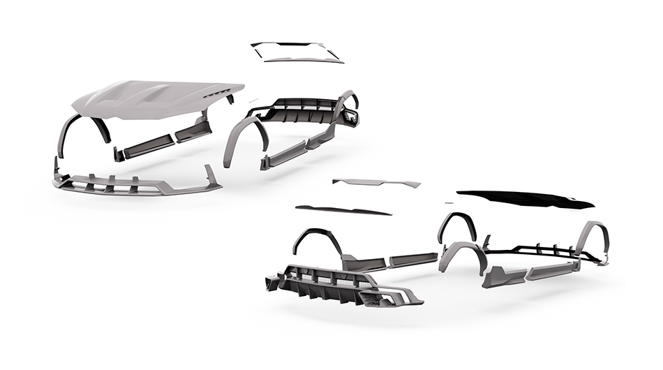 This aerodynamic package consists of 42 pieces. Among the primary components are the rear bumper with a diffuser, the front bumper, a hood, and a comprehensive expansion that incorporates the replacement of the front fenders.